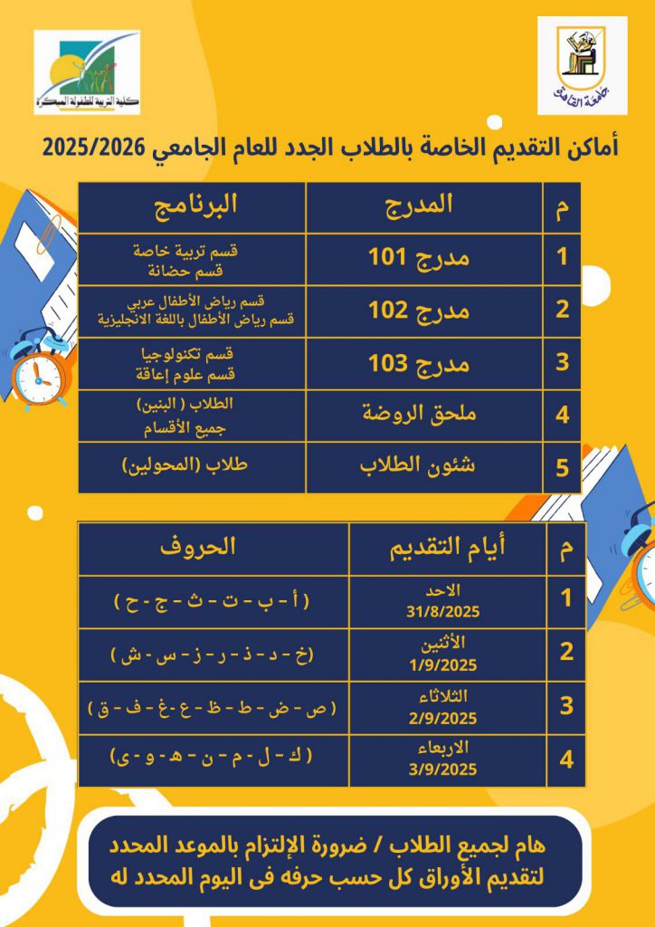وعلى جميع الطلاب الالتزام بالحضور في الموعد المحدد لهم، مصطحبين جميع المستندات الرسمية المطلوبة لاستكمال إجراءات القيد والتسجيل.