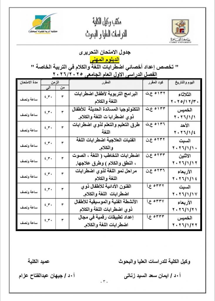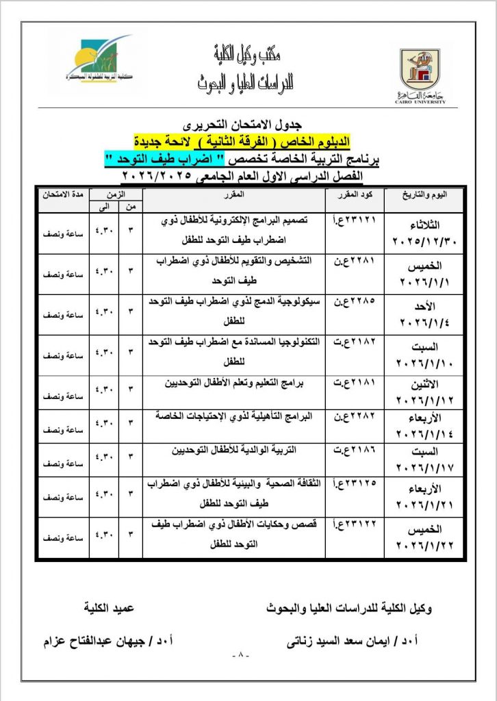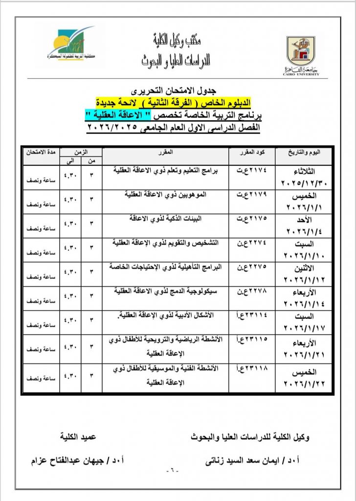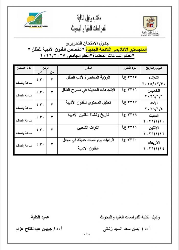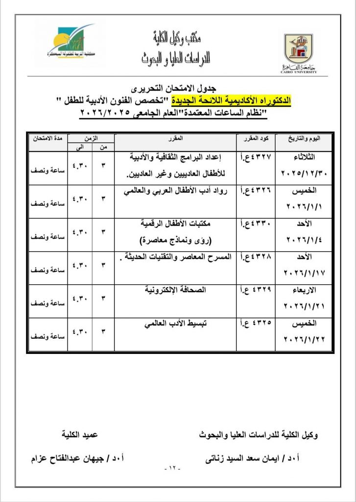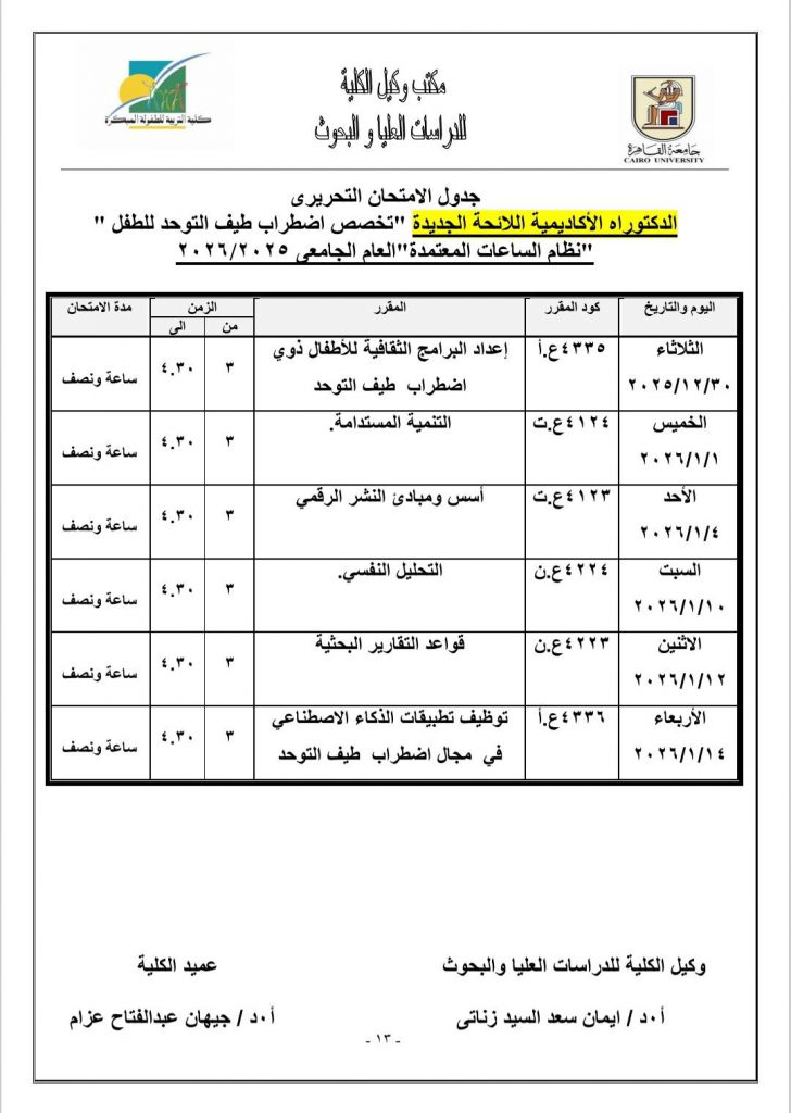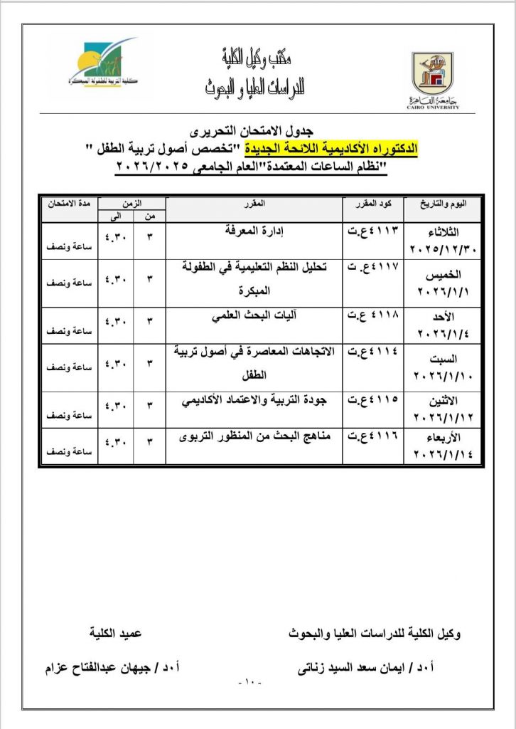 جدول الامتحانات النظرية لمرحلة الدراسات العليا للعام الجامعي ٢٠٢٥- ٢٠٢٦