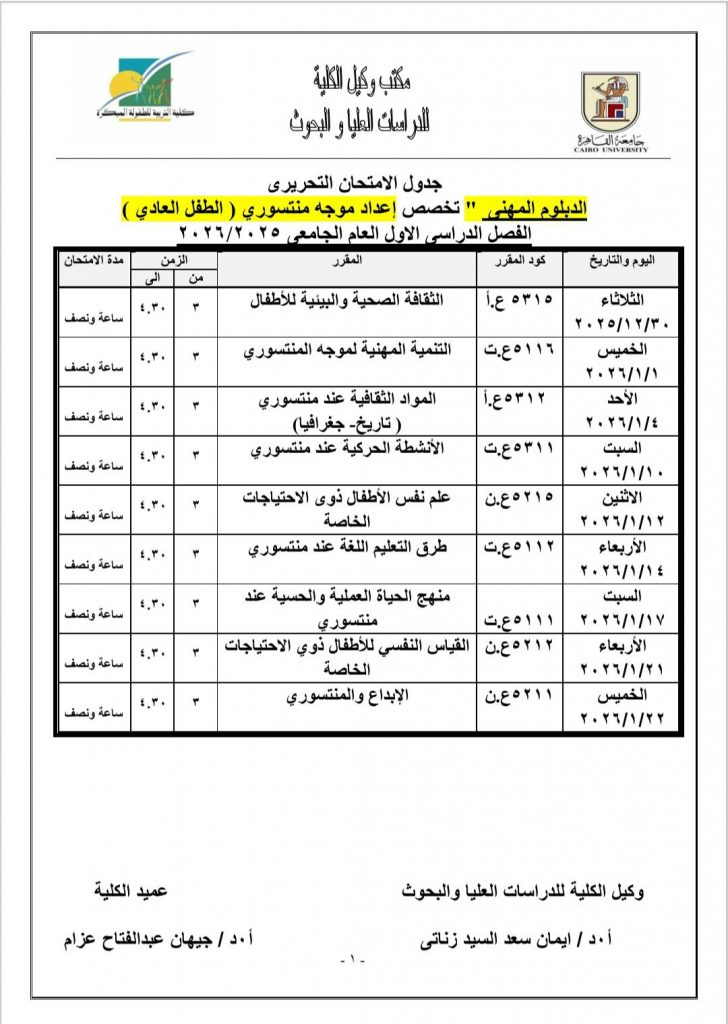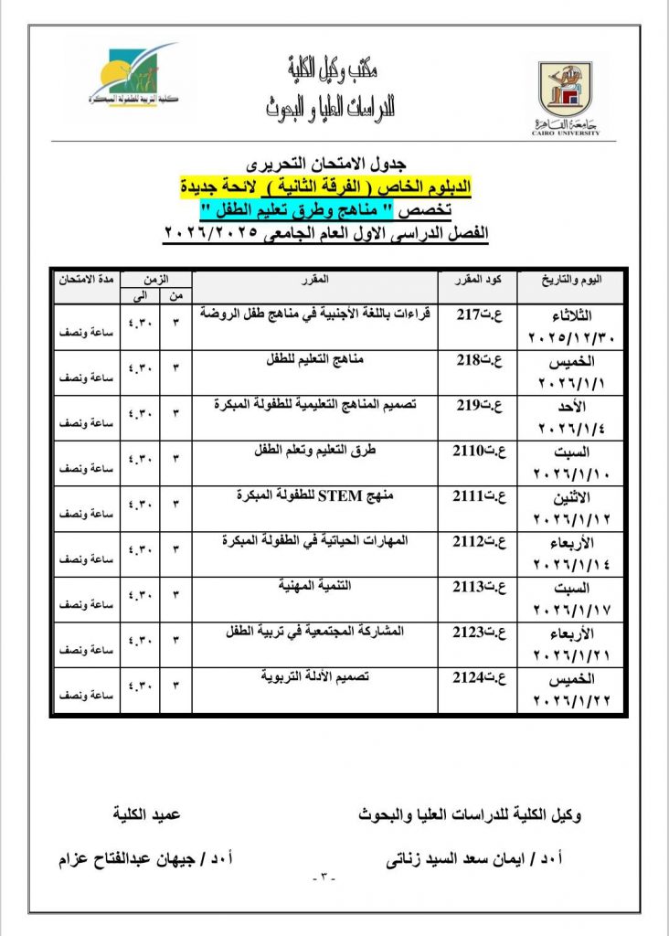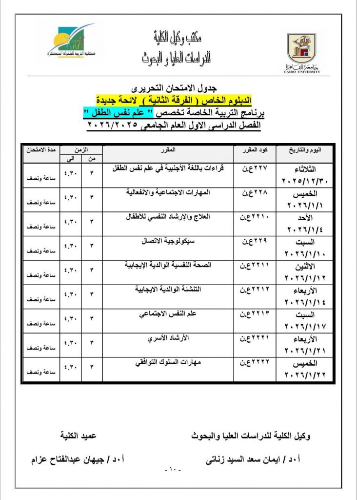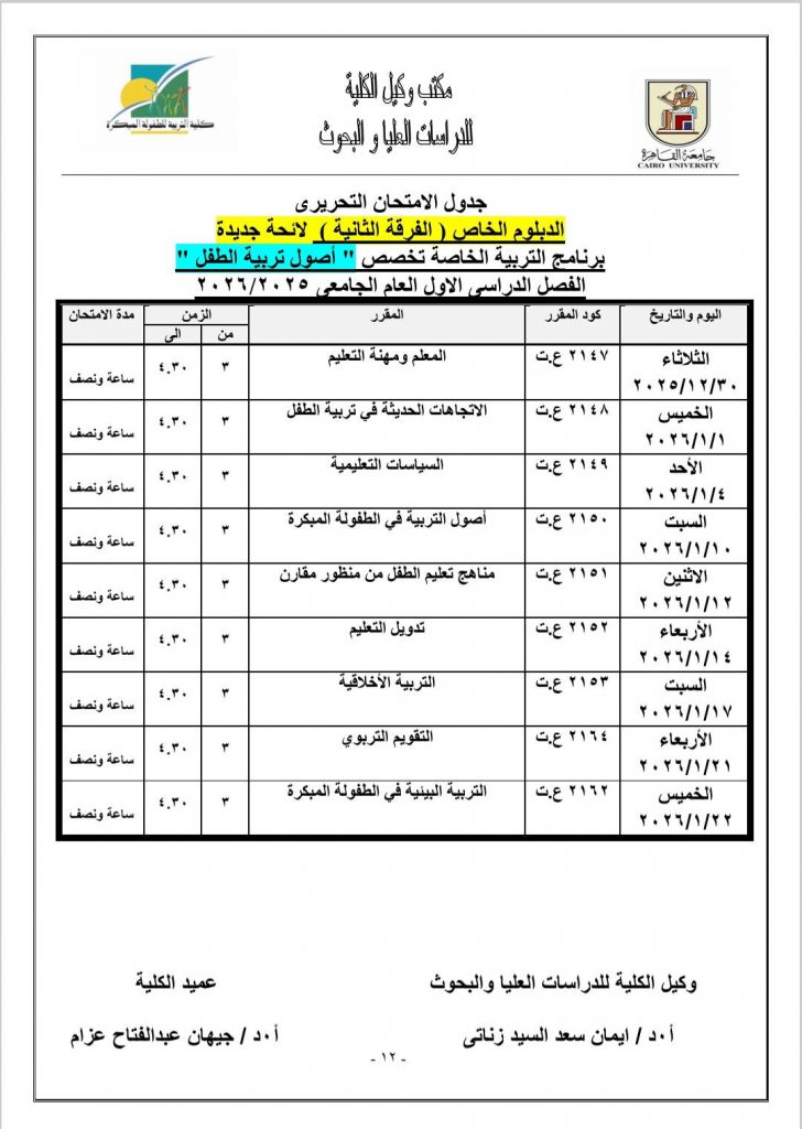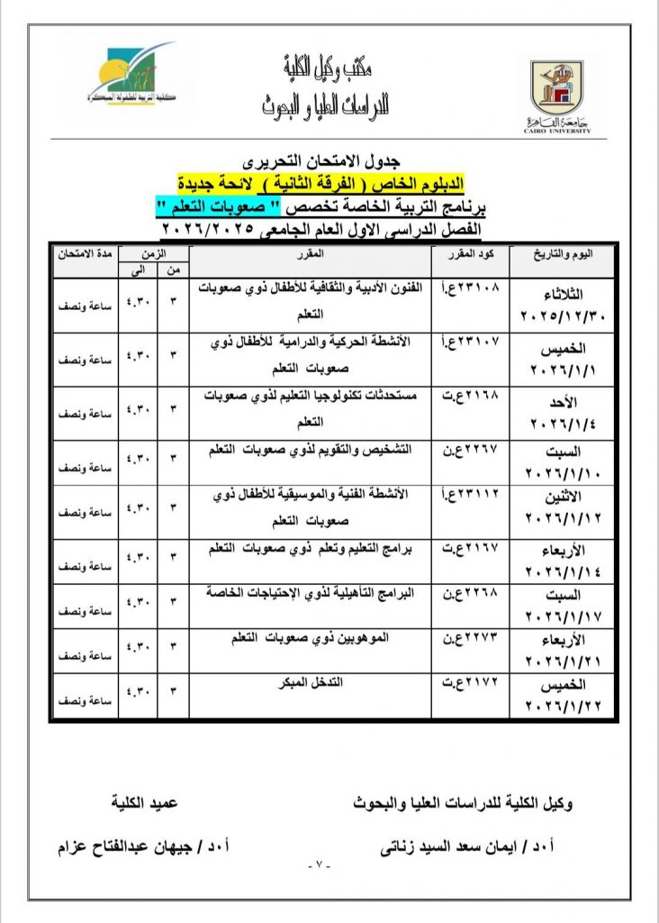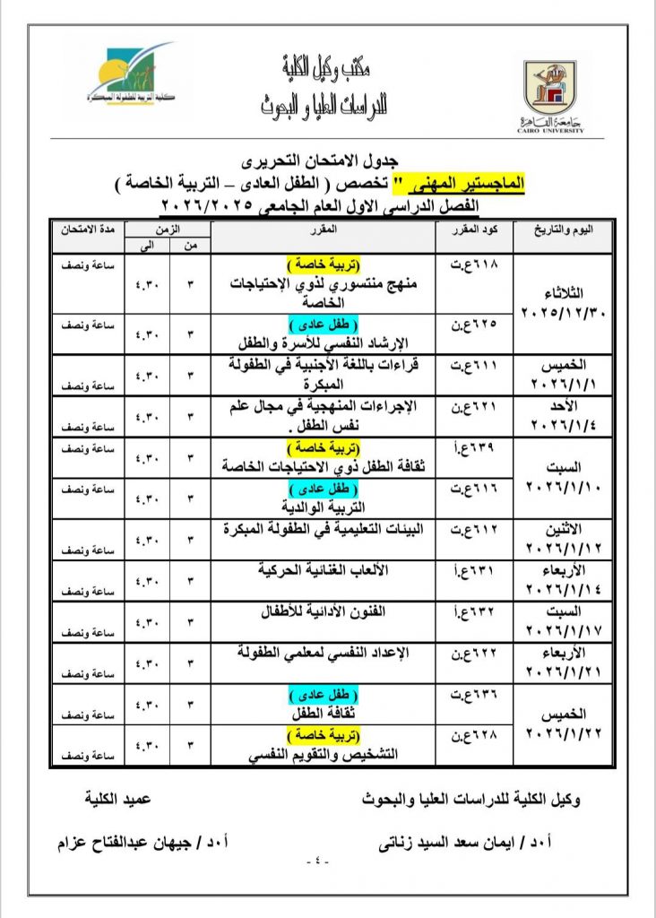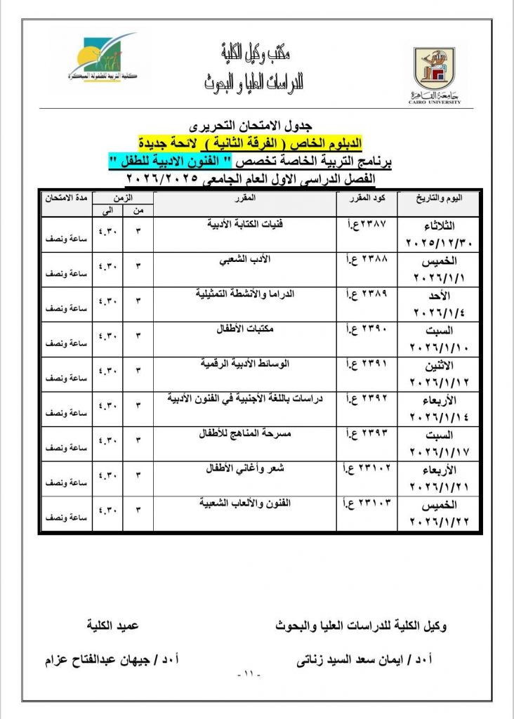 جدول الامتحانات النظرية لمرحلة الدراسات العليا للعام الجامعي ٢٠٢٥- ٢٠٢٦