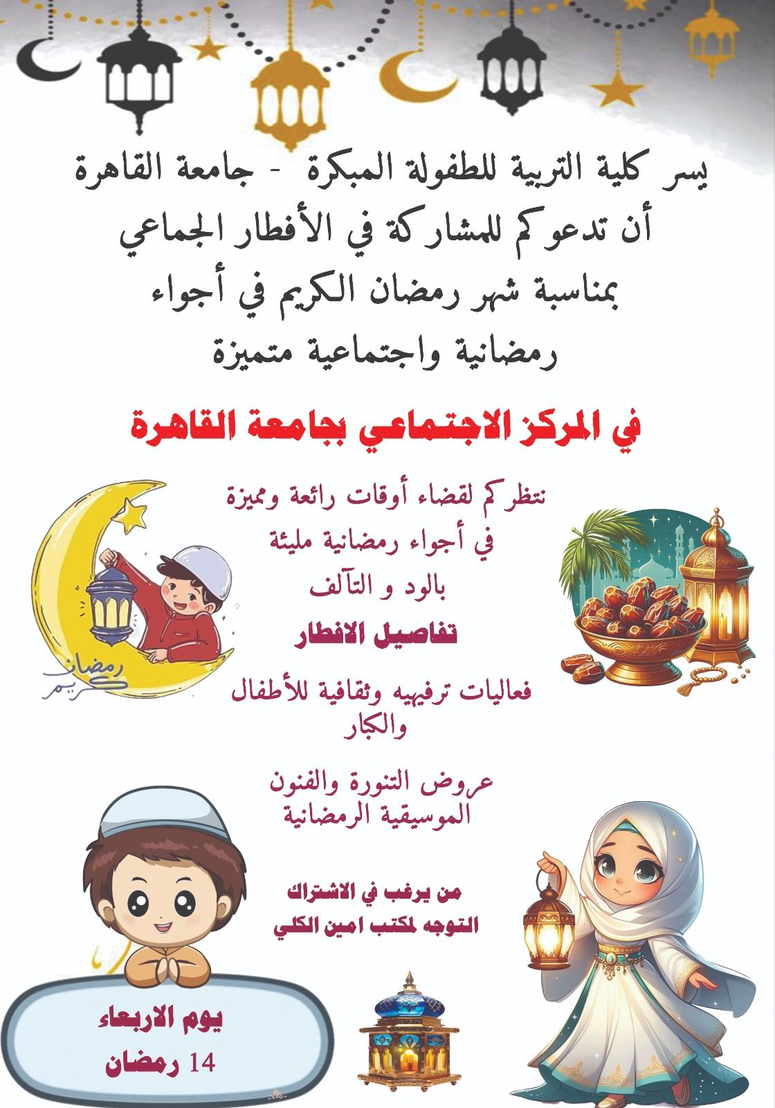 الأفطار الجماعي بمناسبة شهر رمضان الكريم By AdminKind | 28 فبراير، 2026 | لا توجد تعليقات يسر كلية التربية للطفولة المبكرة – جامعة القاهرة أن تدعوكم للمشاركة في الأفطار الجماعي بمناسبة شهر رمضان الكريم في أجواء رمضانية واجتماعية متميزة في المركز الاجتماعي بجامعة القاهرة ننتظركم لقضاء أوقات رائعة ومميزة في أجواء رمضانية مليئة بالود غير مصنف